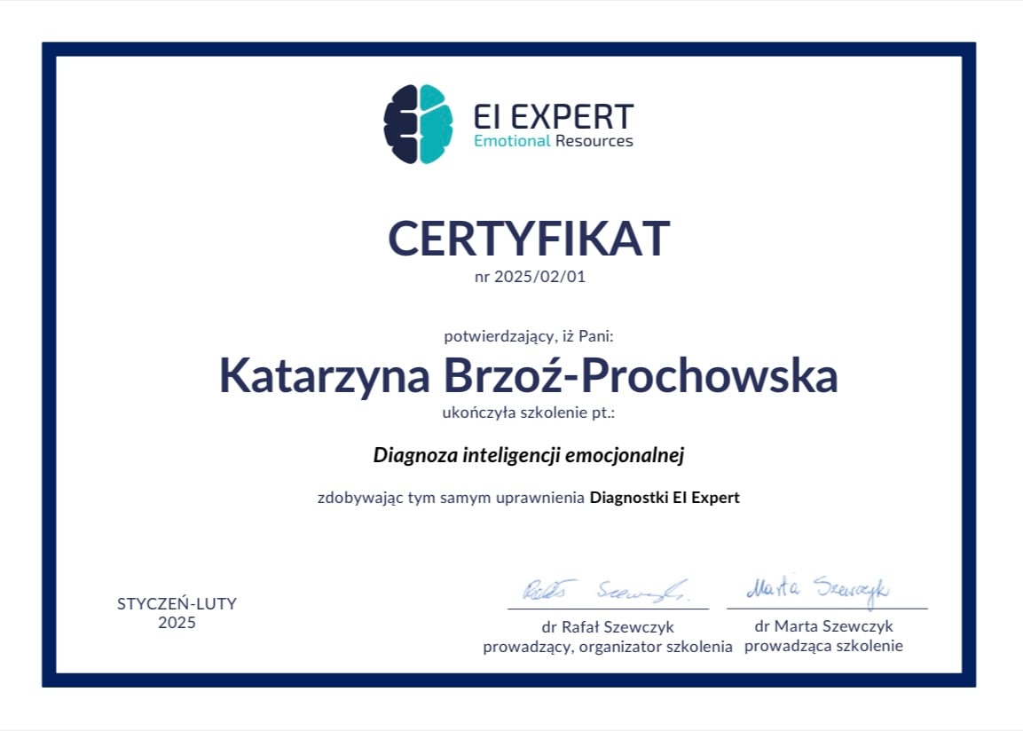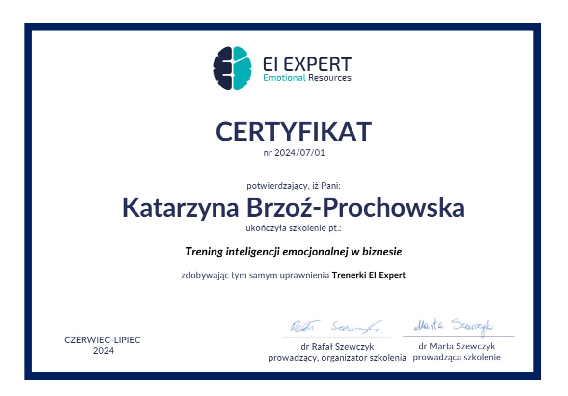 Dziś, jako certyfikowana trenerka i diagnostka inteligencji emocjonalnej (EI Expert), uczę innych, jak powtórzyć ten sukces – bez frustracji i wypalenia.
